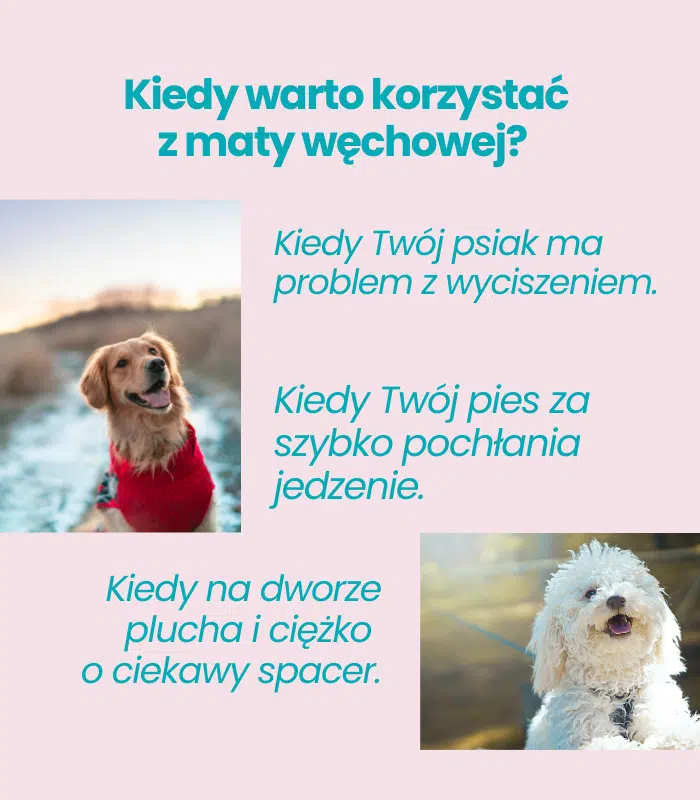 Mata edukacyjna dla psa to niezwykłe narzędzie, które zapewnia mnóstwo korzyści dla Twojego pupila. Doskonale stymuluje jego umysł, uspokaja, rozwija i redukuje stres. Często polecana przez specjalistów jako pomoc w pracy nad problemami behawioralnymi, mata ta zajmuje psa intelektualnie, pomagając w wyciszeniu i odpoczynku. Warto dodać, że mata edukacyjna zaspokaja jedną z najważniejszych potrzeb psa – rozwój węchu. Szukanie smakołyków w matach węchowych uczy psa cierpliwości, skupienia oraz samodzielności, skutecznie spowalniając zbyt szybkie jedzenie u psiaków. Jak najbardziej można również wykorzystać matę do podawania posiłków, co sprawia, że karmienie staje się bardziej angażujące i zdrowe. Mata edukacyjna jest również doskonałą alternatywą do zabaw na świeżym powietrzu, zwłaszcza w dni, gdy pogoda nie sprzyja spacerom. To świetna rozrywka, która pomagająca zaspokoić naturalną ciekawość i energię czworonoga.