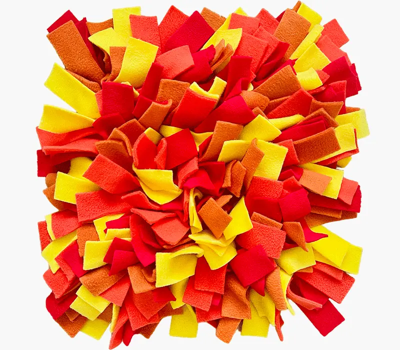 Mata węchowa szyta w rozmiarze około 35 cm x 40 cm wykonana jest ręcznie, z poliestrowej podstawy oraz dzianiny polarowej. To genialna zabawka dla Waszego najważniejszego członka rodziny. Każdy psiak, niezależnie od rozmiaru, pokocha wyszukiwanie swoich ulubionych smaczków w gąszczu polarowych frędzli.
