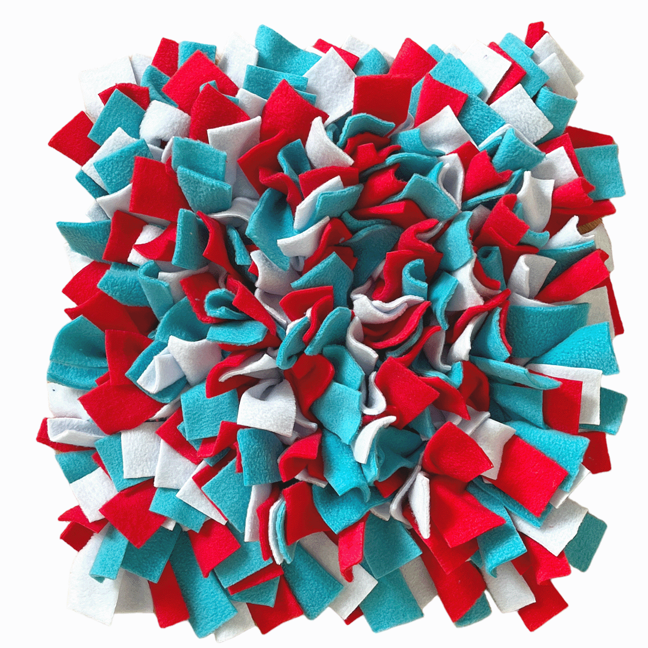 Węchowa mata dla psa, szyta w rozmiarze około 40 cm x 40 cm wykonana jest ręcznie, z poliestrowej podstawy oraz dzianiny polarowej. To genialna zabawka dla Waszego najważniejszego członka rodziny. Każdy psiak, niezależnie od rozmiaru, pokocha wyszukiwanie swoich ulubionych smaczków w gąszczu polarowych frędzli.