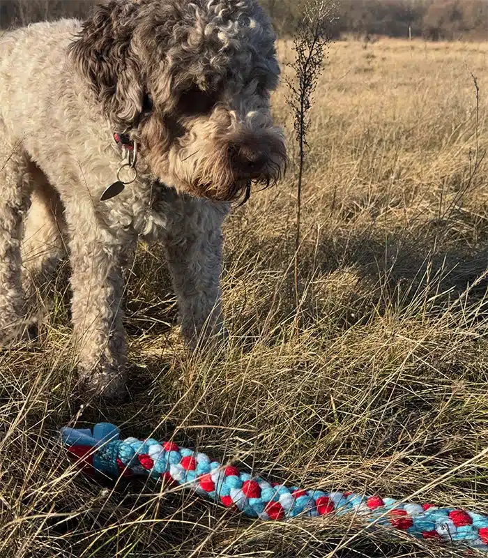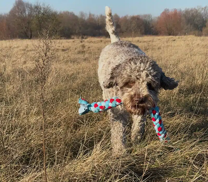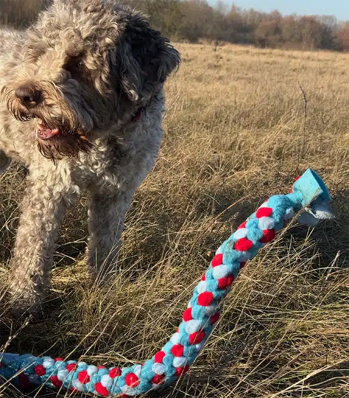 • Zachęcaj psa do zwrotu zabawki: Kiedy pies załapie przedmiot, wprowadź komedę do jego puszczania. Może to być „puść” lub dowolnie przez Ciebie wybrana inna komęda, która będzie sygnalizowała psu zwot zabawki. Gdy pies odda szarpak, pochwal go słownie lub nagrodź ulubionym smaczkiem. To wzmocni pozytywne zachowanie.